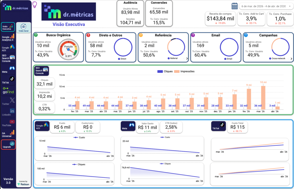 Imagine ter todos os seus dados de performance – de Google Analytics a TikTok, de campanhas de busca a redes sociais – centralizados, organizados e prontos para uso.